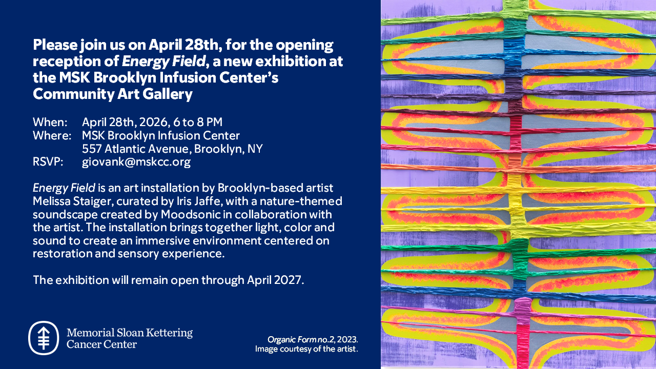 Curated by Iris Jaffe and selected in collaboration with MSK patient representatives and staff at the Brooklyn Infusion Center, Energy Field will be on view from April 28, 2026 through April 2027.